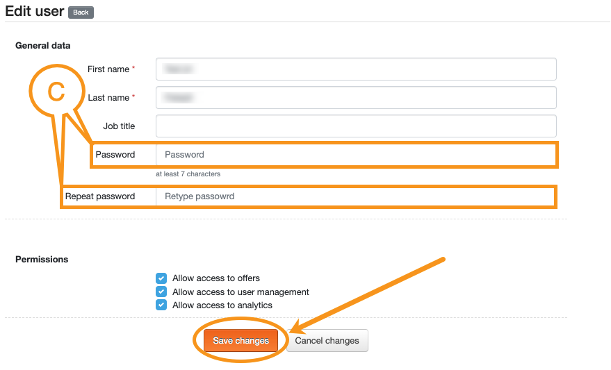 The password may be changed in the User management (My/ My Account). Select the user for whom the password needs to be changed. Then click on the “brush” icon (Edit user). A window will be opened where the user data may be edited, including the password.