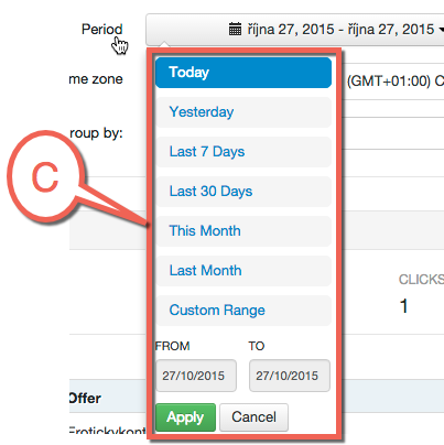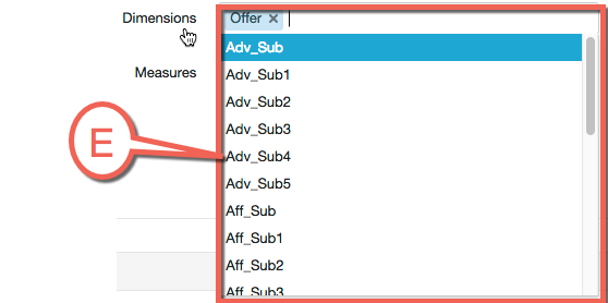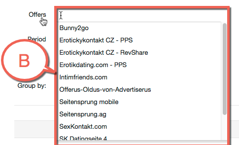 Dimension – here you can select the values you are interested in. The list of values includes the following items: Adv_Sub(0-5), Aff_Sub(0-5), ConnectionType, ConversionType, Country, CretaiveID, DeviceBrand, DeviceModel, DeviceOS, DeviceType, Event, MobileOperator, Offer, and Source.