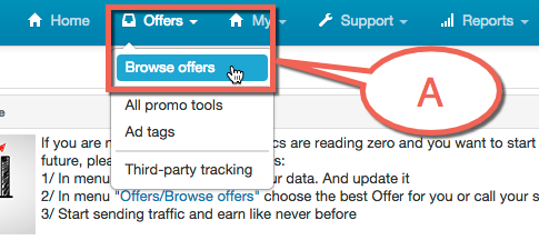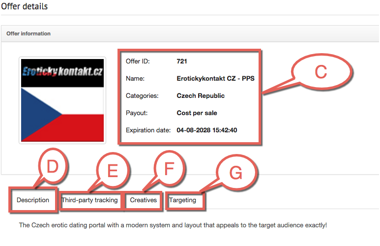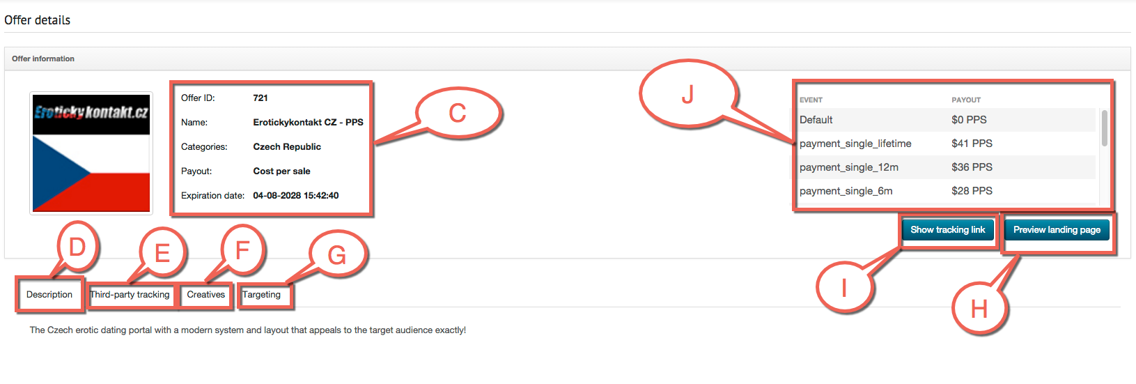 In the offer details, you can see all important informations about the offer and you can perform operations like generating links to propagate the offer, adding the personal variables for monitoring own campaigns, selection of a suitable banner or adding the personal counter to the Event.