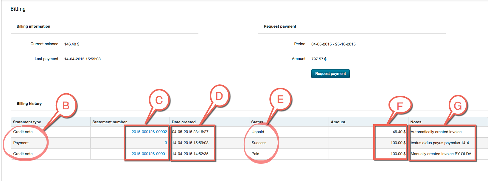 The invoice is generated after the payment request. You can find it under your account in the “My / Billing” menu. Here you can see a Billing history. There is written Statement type, Statement number, Date created, Status, Amount and Notes